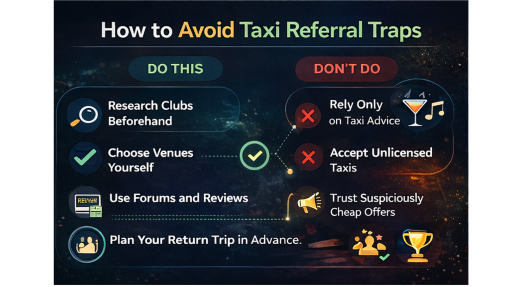 Finally, there is greater awareness among visitors. Many people already know about taxi referral systems in nightlife cities and are more cautious when drivers strongly recommend specific venues.