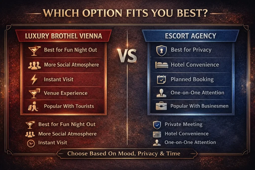 Many men visiting Austria compare two premium adult options: a luxury brothel in Vienna or a private escort agency. Both can offer high-end sex services, attractive women, and discreet experiences, but they are built for different needs.